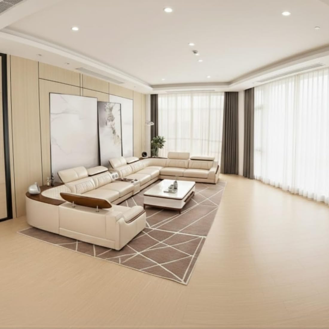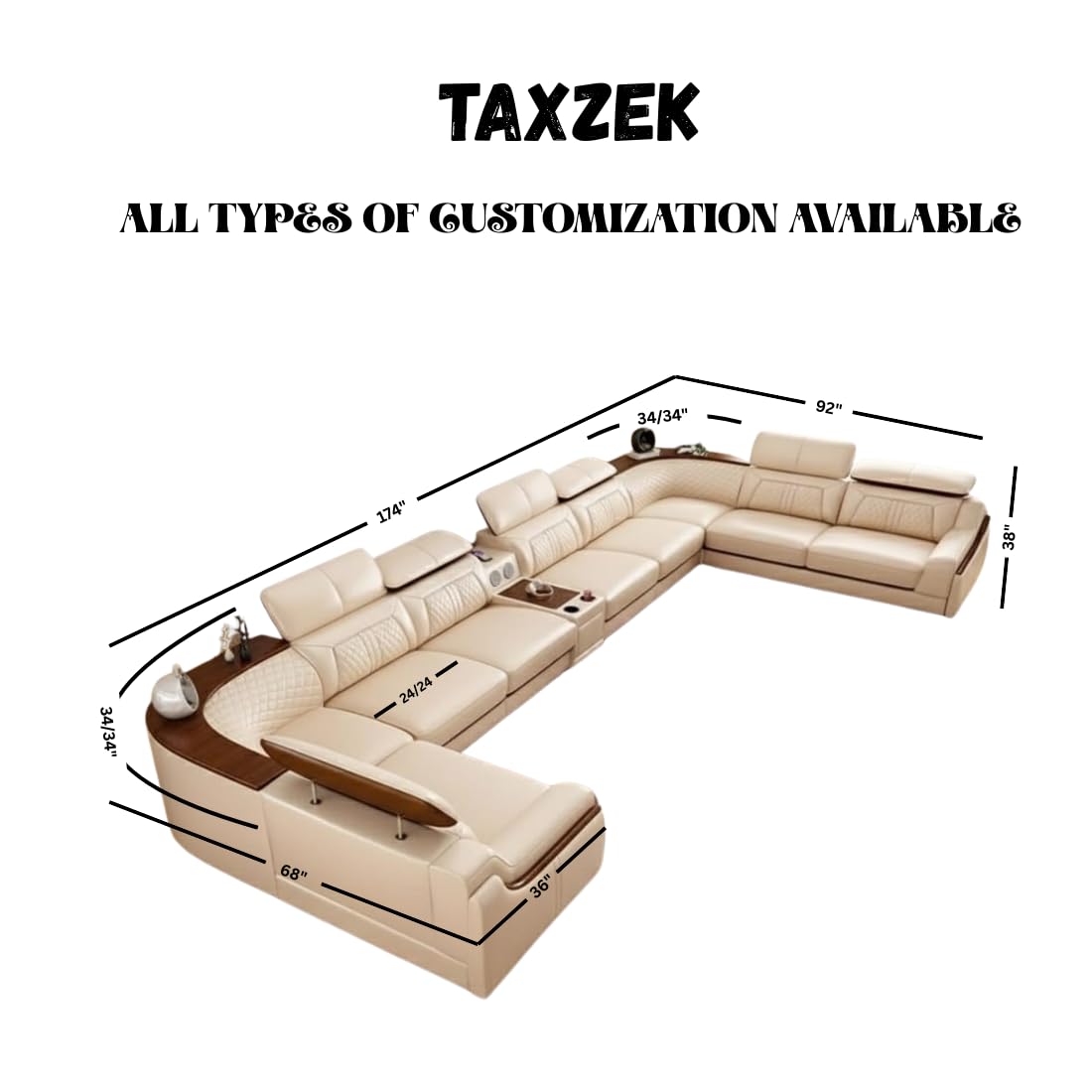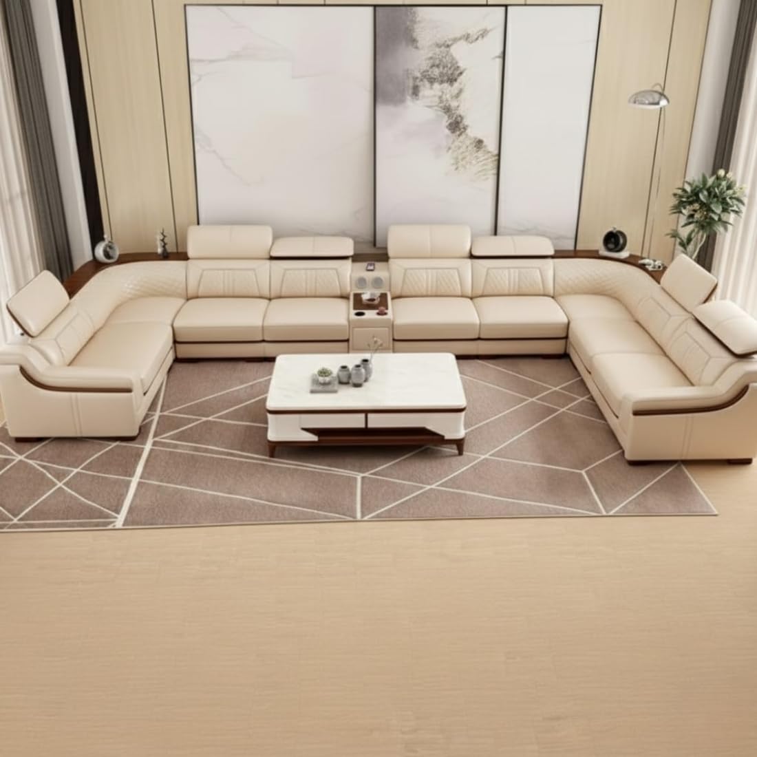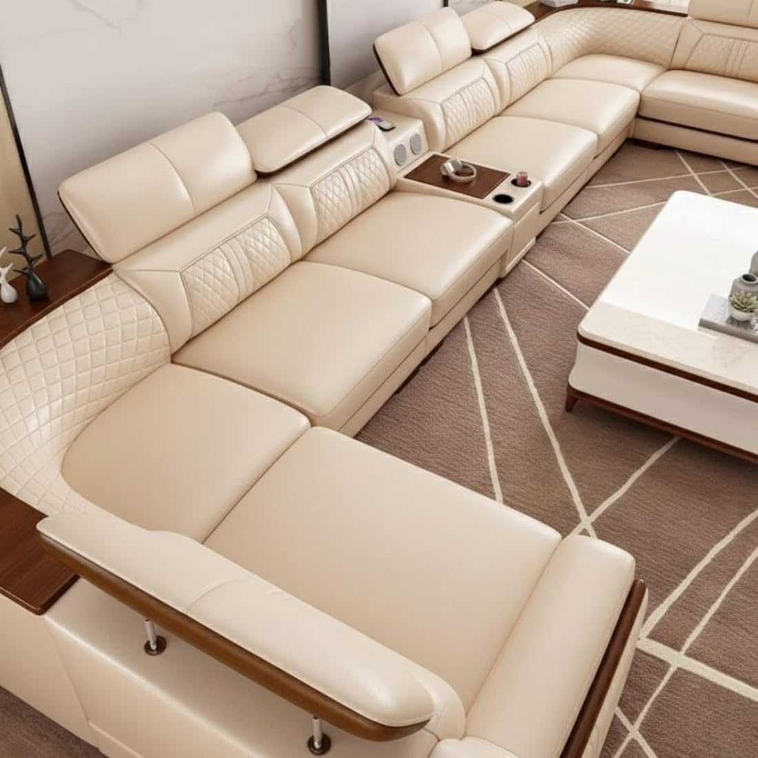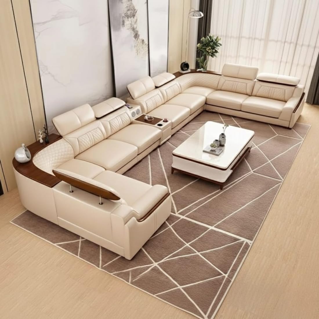 Grand Majesty Smart U-Shaped Sectional Sofa | Cream White Leather | Multi-Functional Modular with Surround Sound | Cup Holders | Adjustable Headrests | Wooden Polish Accents.