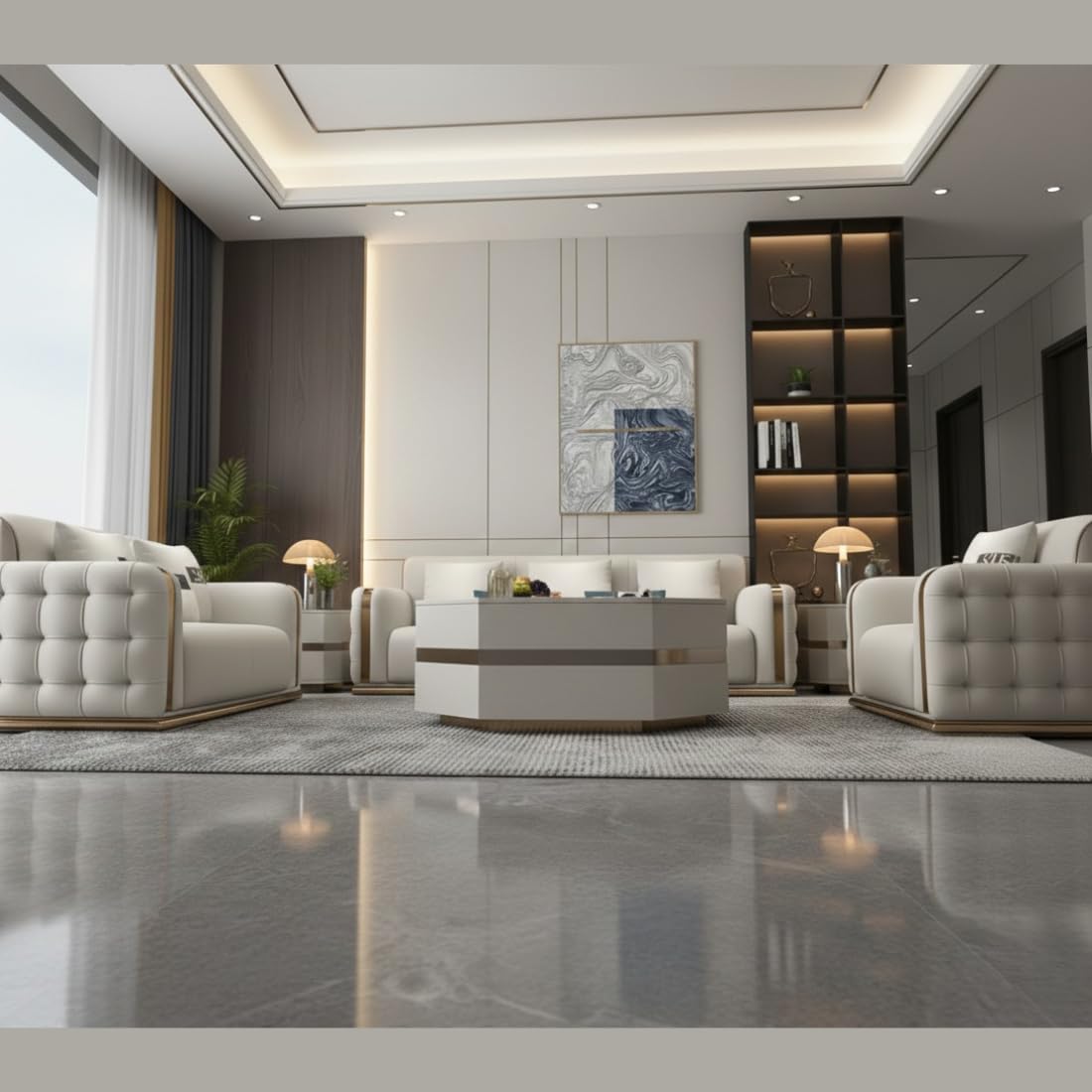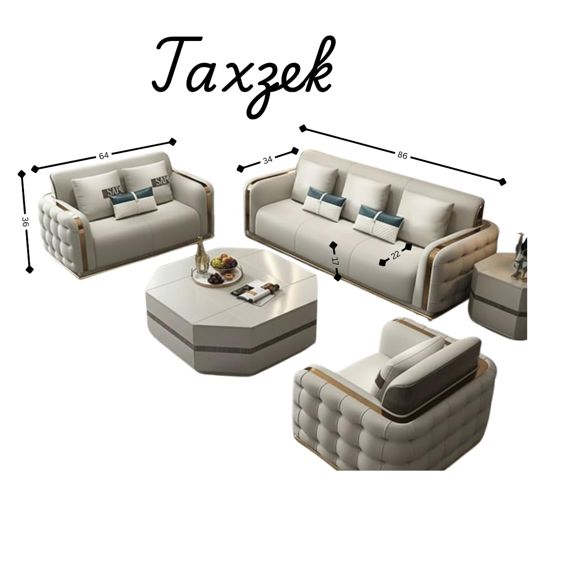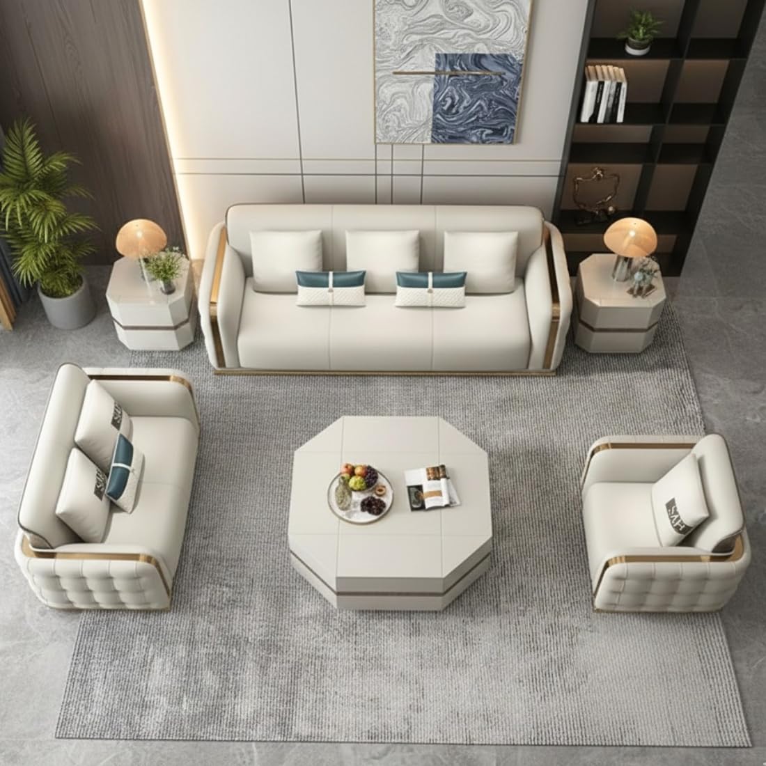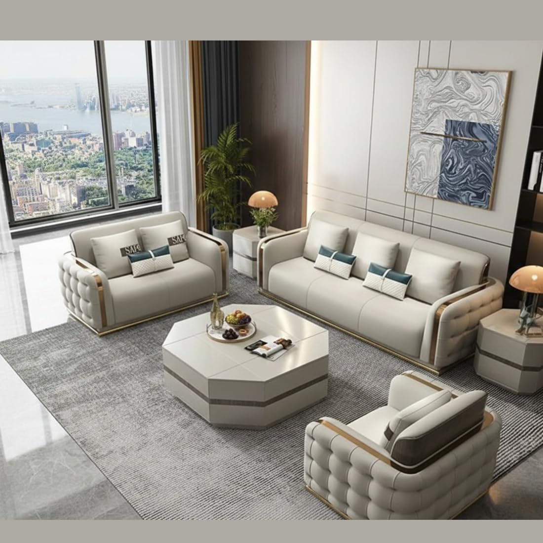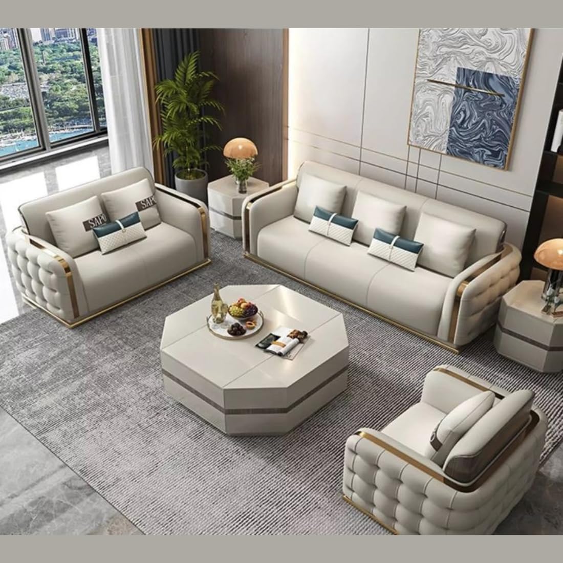 Luxurious Cream Leather Sofa Set with Gold Accents | Tufted Design | Modern Elegant Living Room Furniture | Contemporary Lounge Seating.