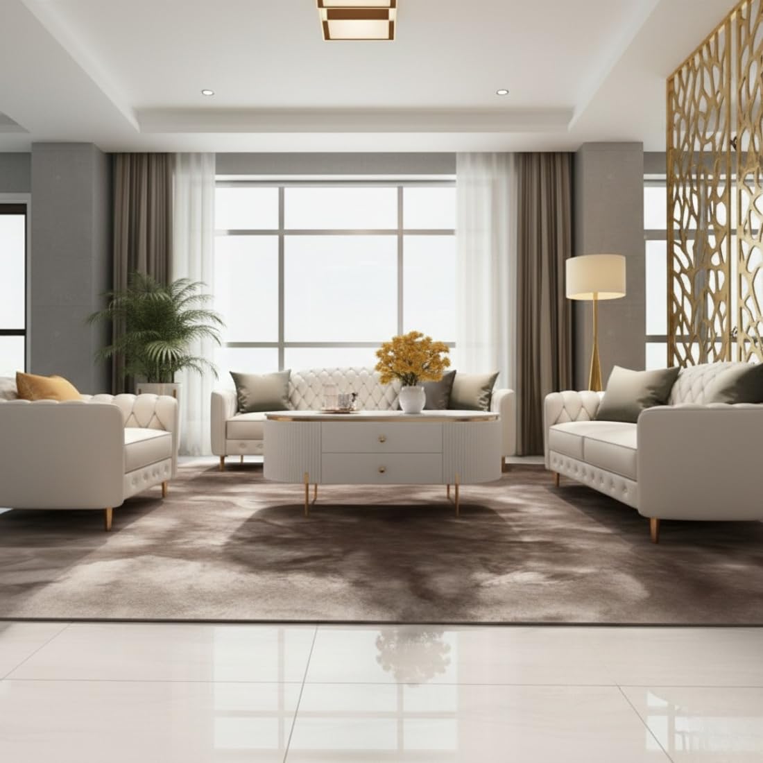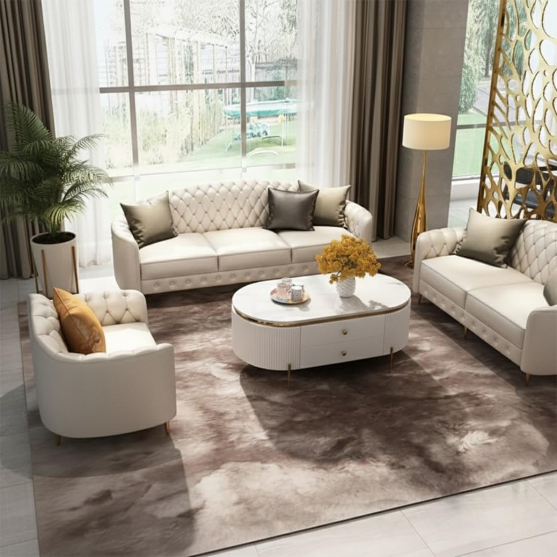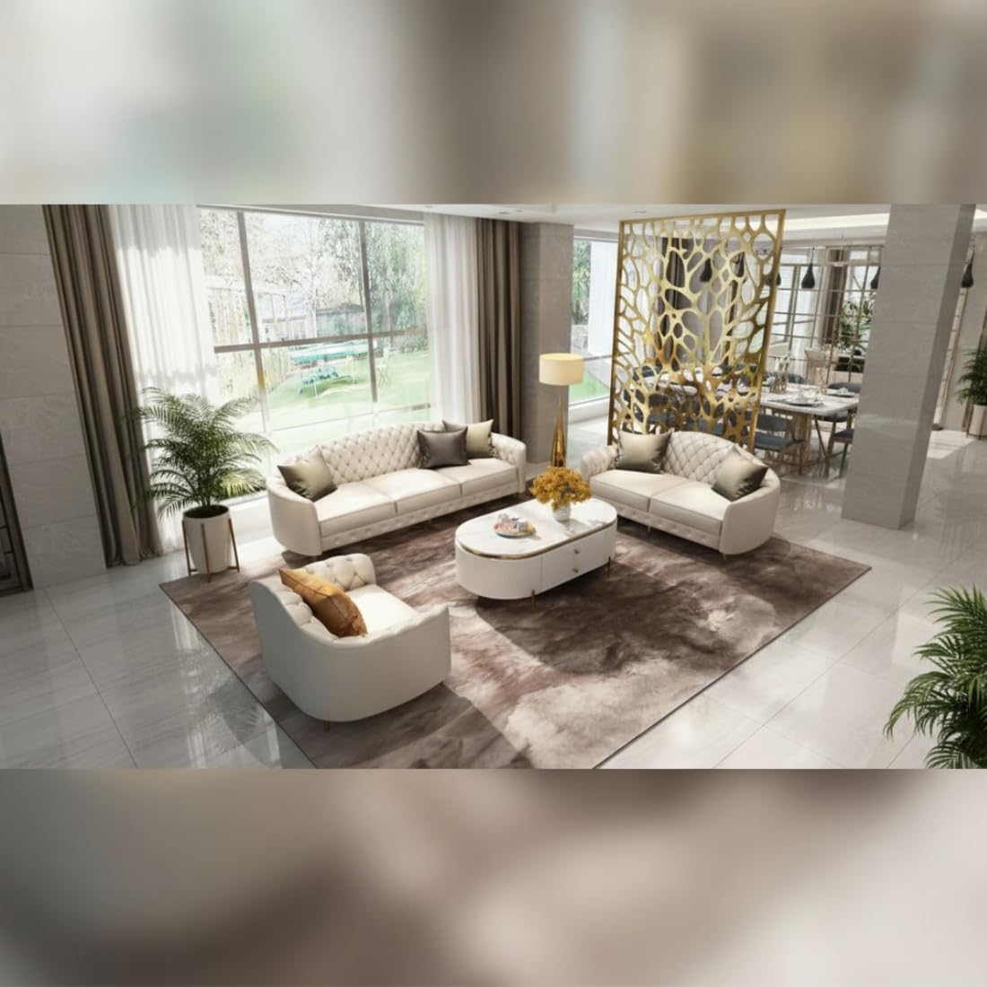Luxurious Modern Sofa Set|White Curved Sectional Couch with Marble Coffee Table and Gold Decorative Screen
