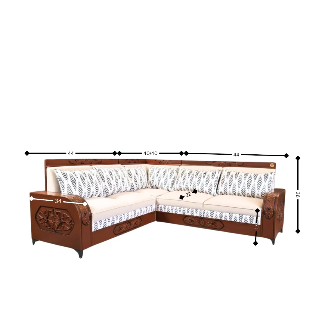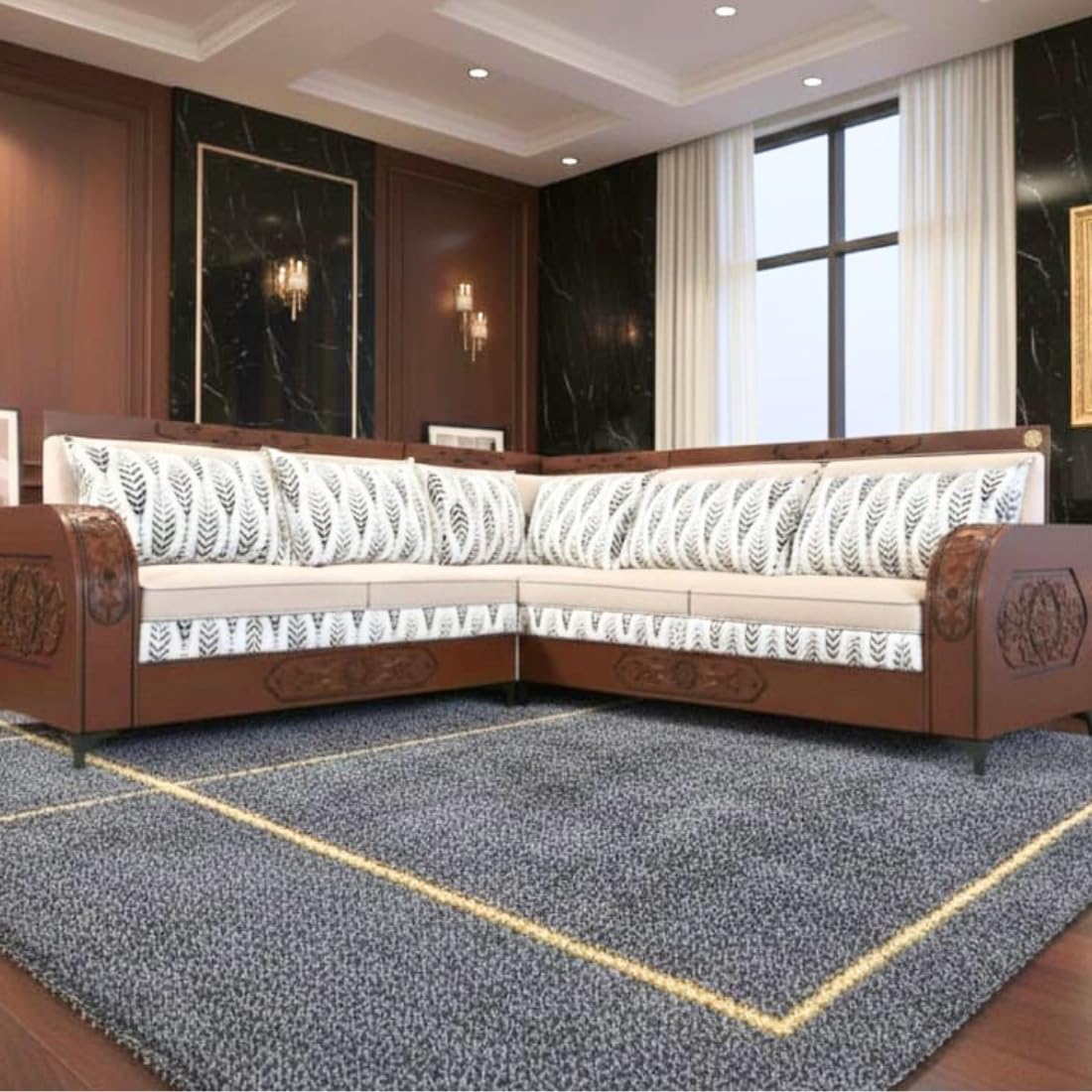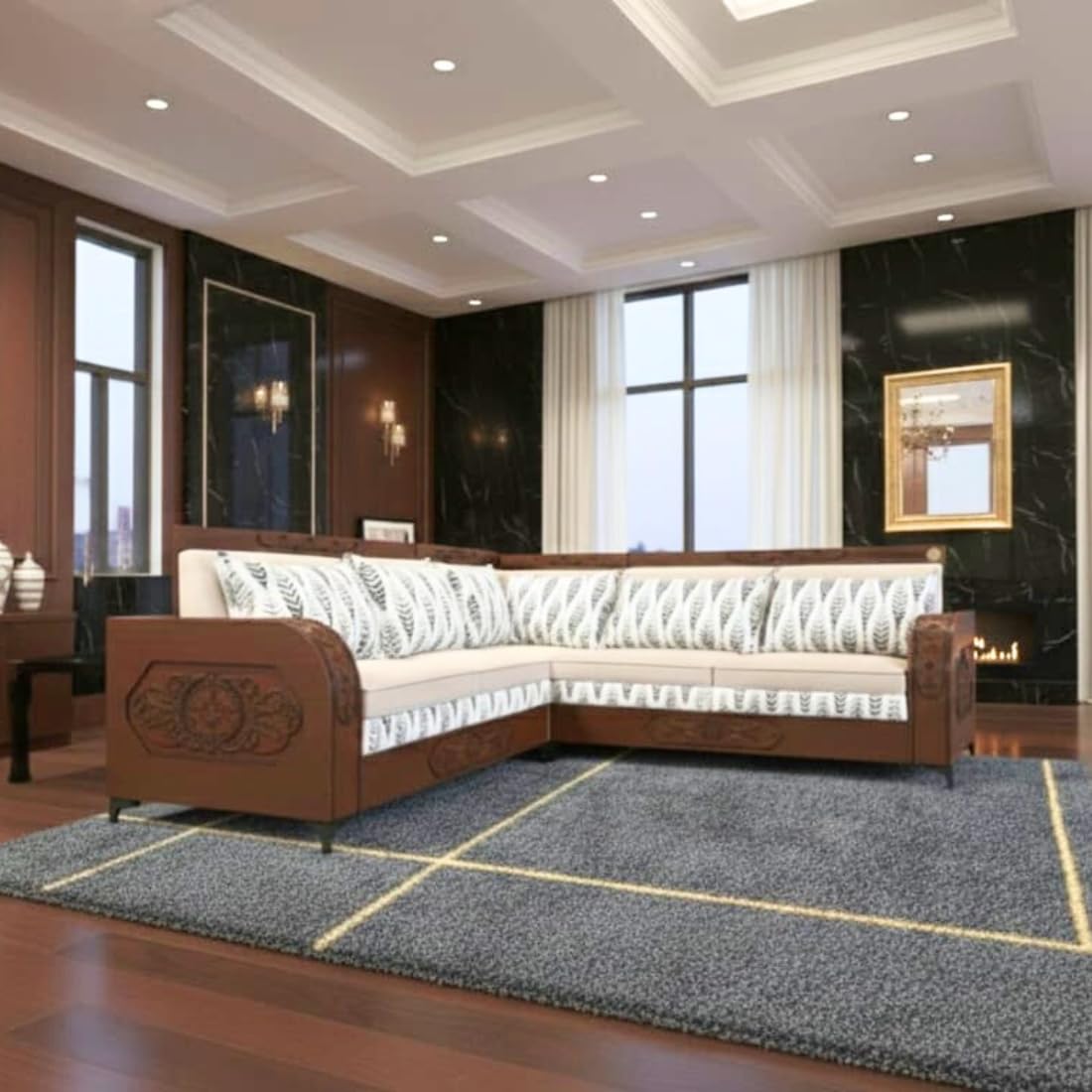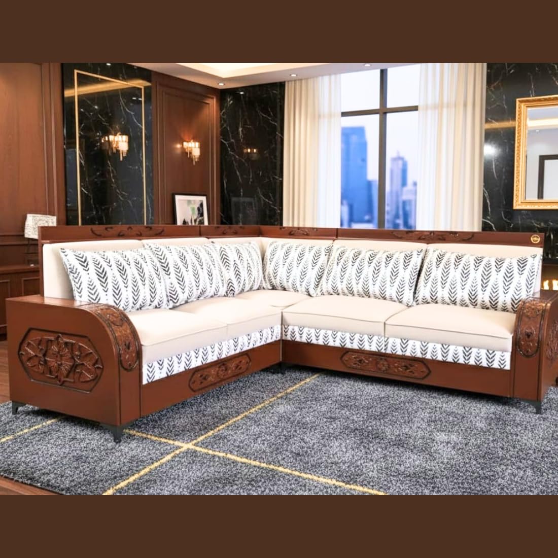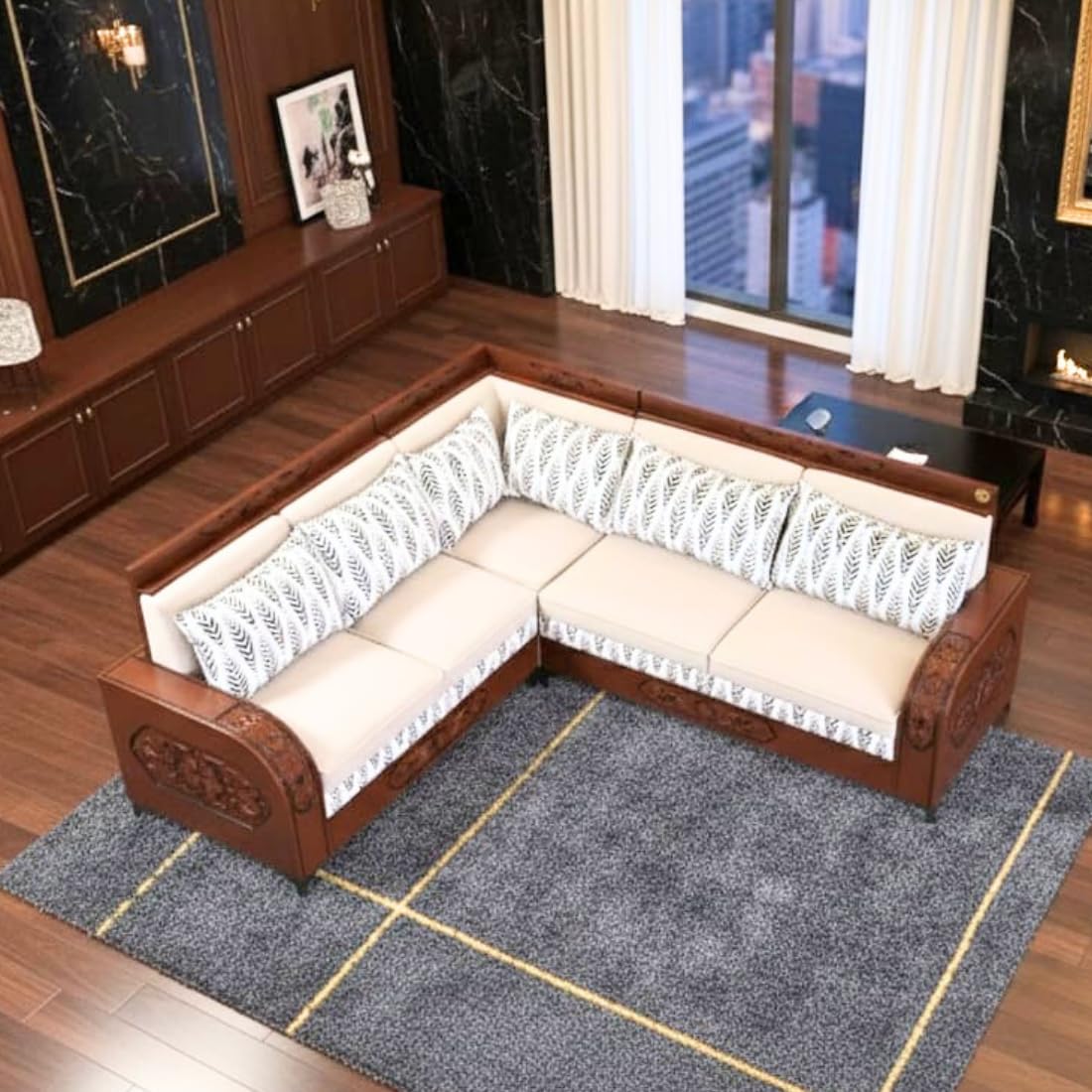 Luxury L-Shaped Sectional Sofa| Carved Wood Furniture| Modern Living Room Couch with Decorative Pillows