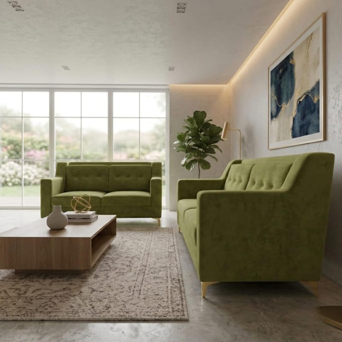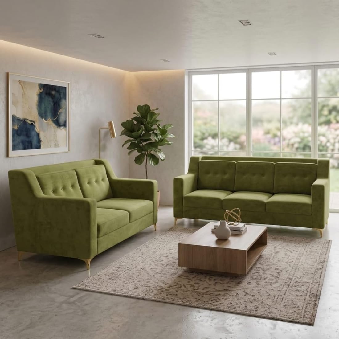 Modern 5 Seater Sofa Set with Pillow Back | Button Tufting | and Golden Stainless Steel Legs | Olive Green | 2 Piece.