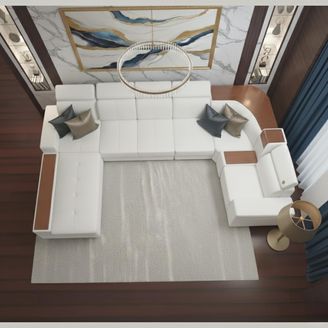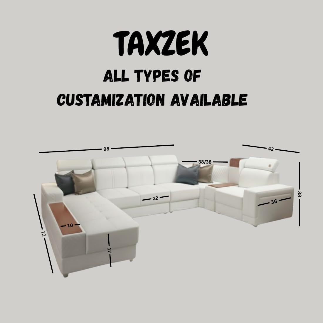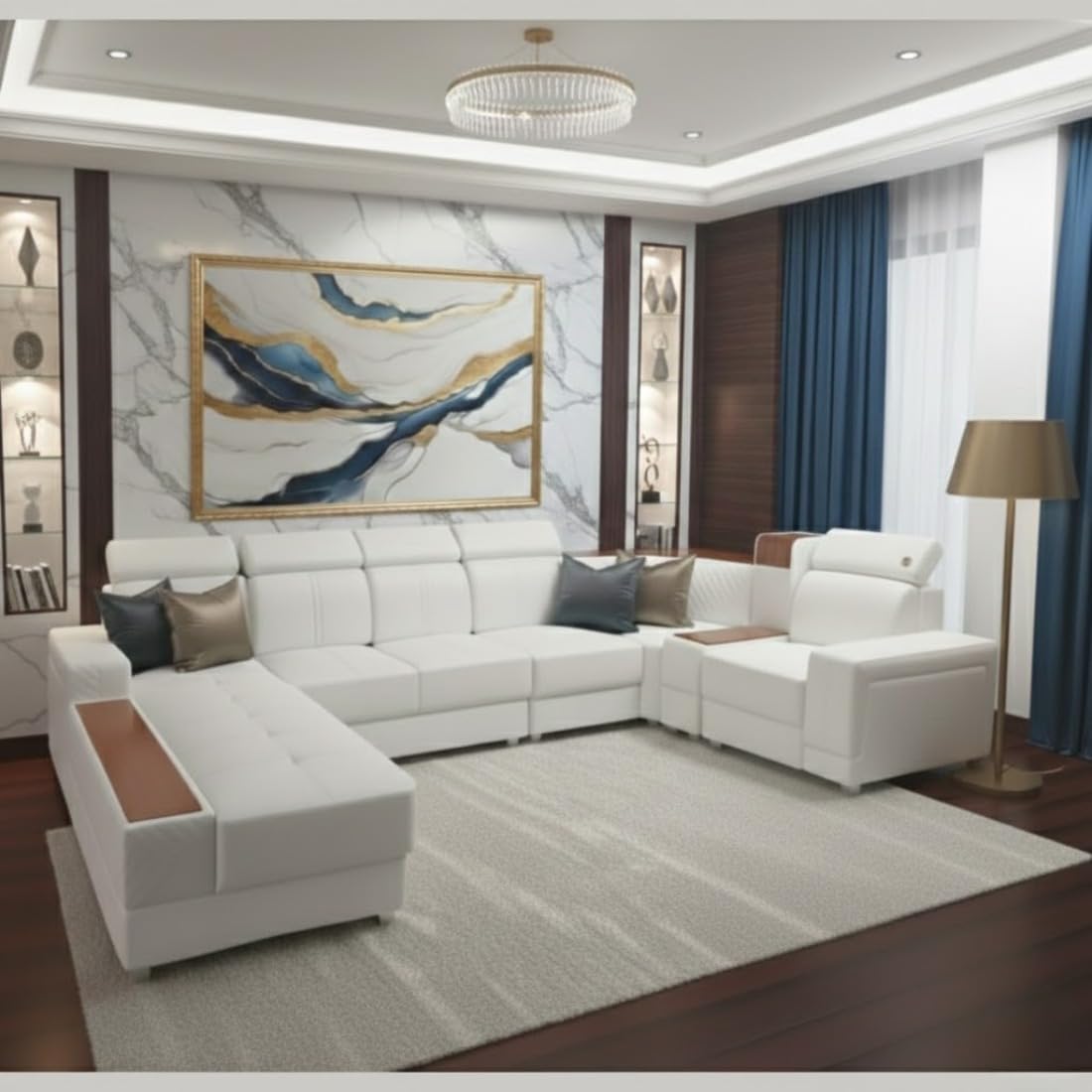 Modern U Shape Sofa Set with Adjustable Headrest | White Leather | Stainless Steel Legs | Wooden Accents | Luxury Design.