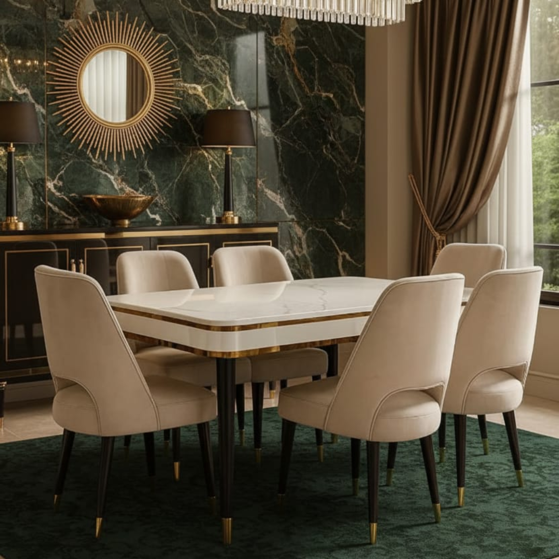 - Complete Dining Set: 6-seater wooden dining table set includes 1 marble top table and 6 beige vintage upholstered chairs, perfect for family gatherings and dinner parties
