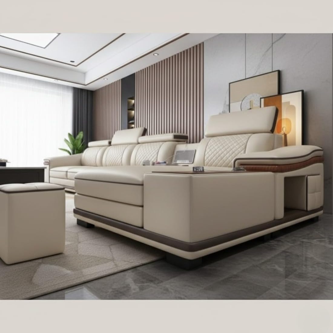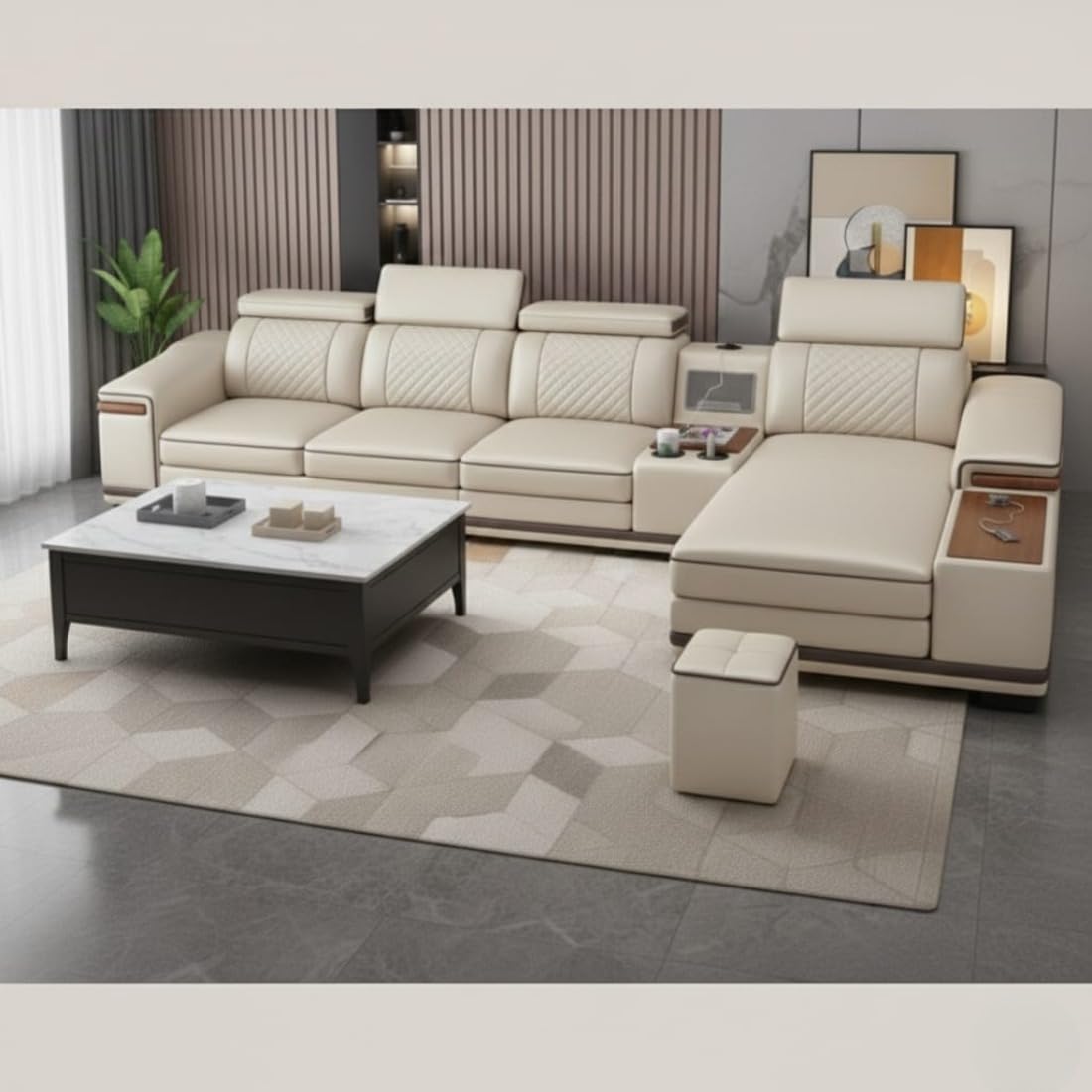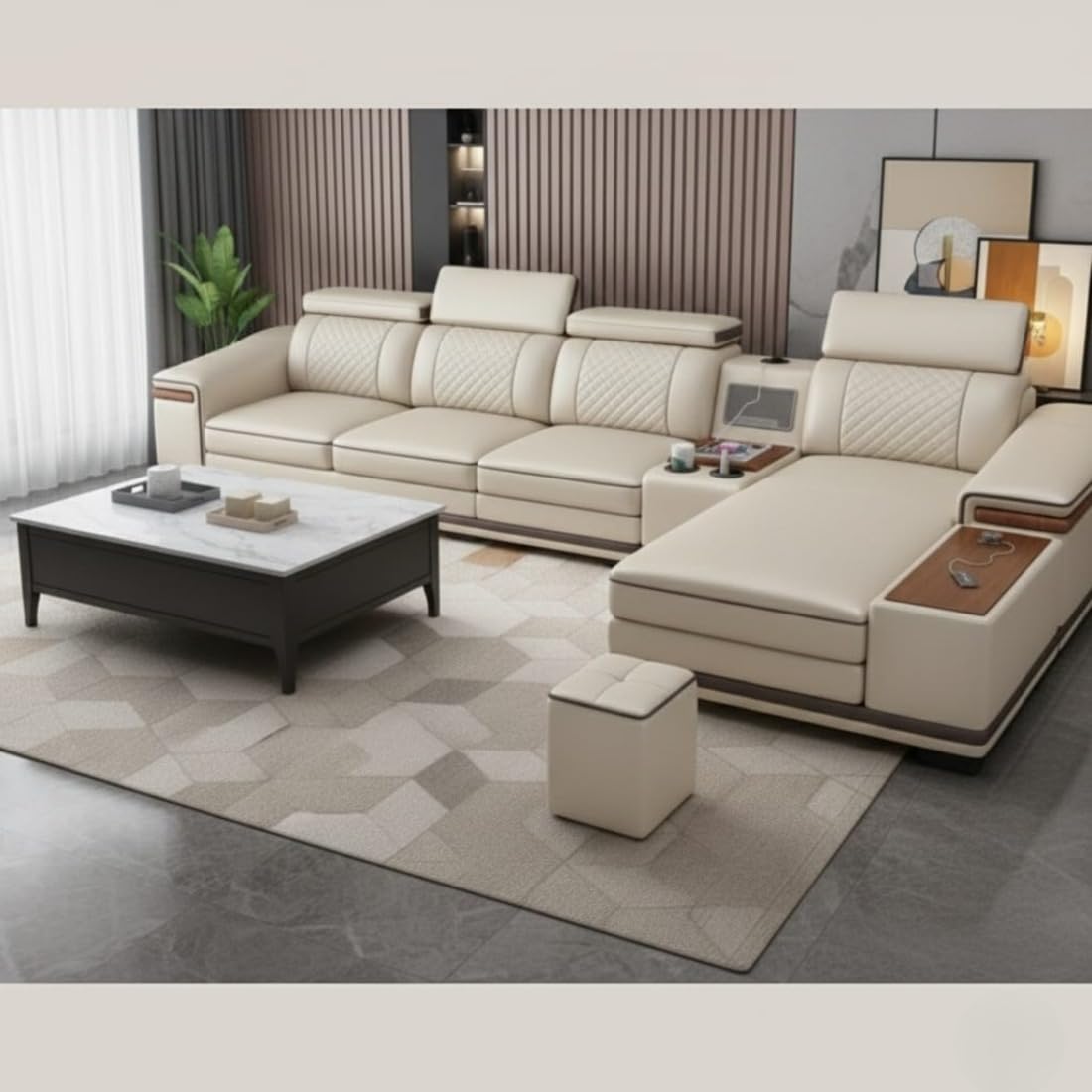 Taxzek Imperial L-Shape Luxury Sofa Set with Lounger, Premium Beige Leather, Wooden Finish Accents, Built-in Speakers with USB Connectivity, Storage Console, 2 Stools Included