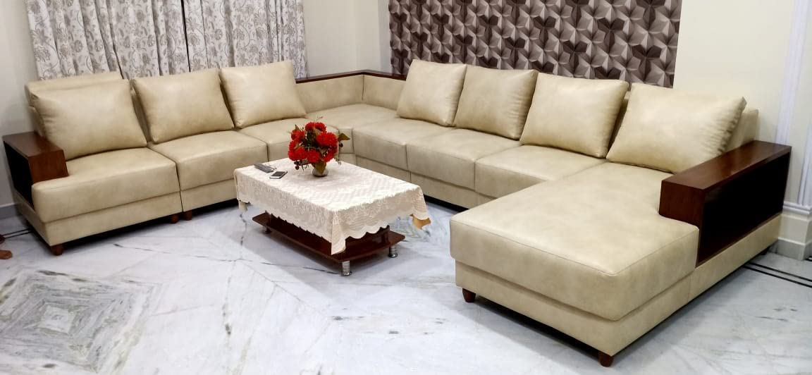 Taxzek Luxurious U Shape Sofa Set with Launcher and Center Table (Beige)