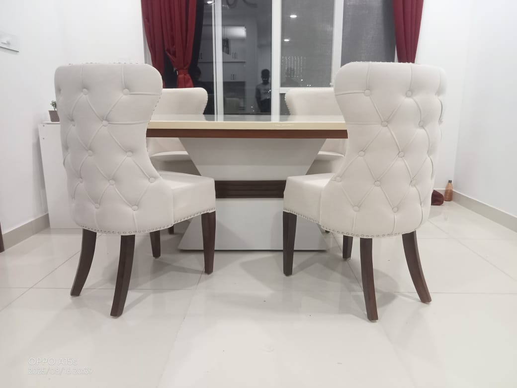 - ELEGANT DESIGN: Modern dining set featuring tufted button detailing and curved backrest chairs upholstered in luxurious white fabric for sophisticated dining room appeal