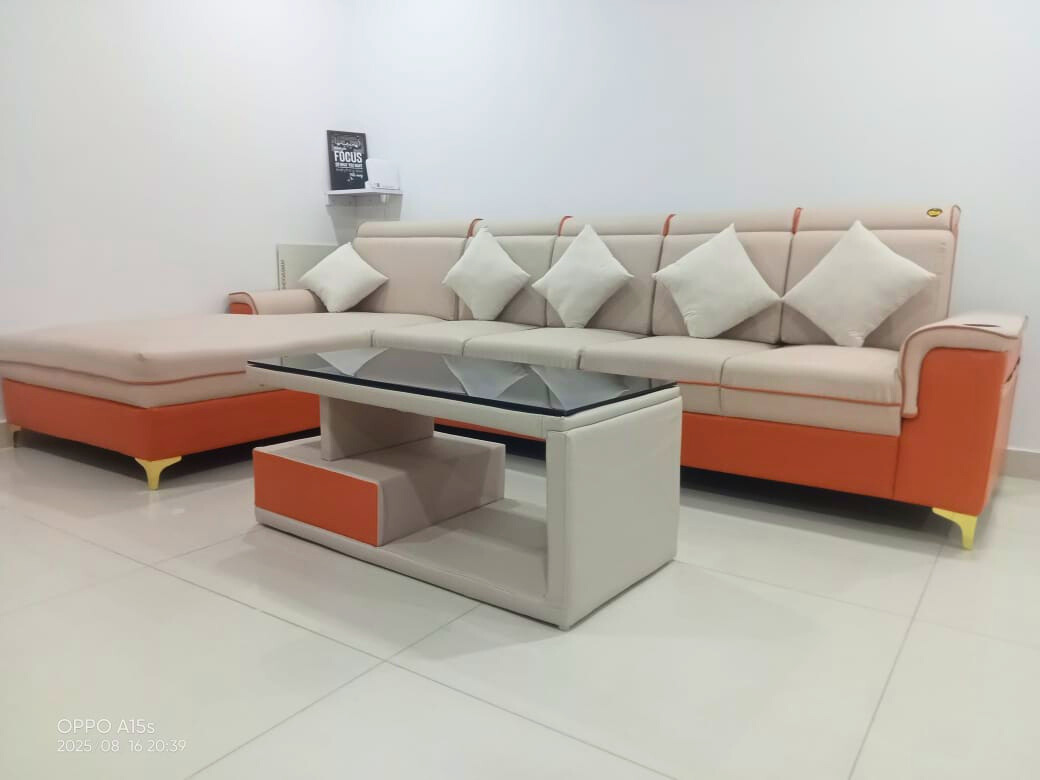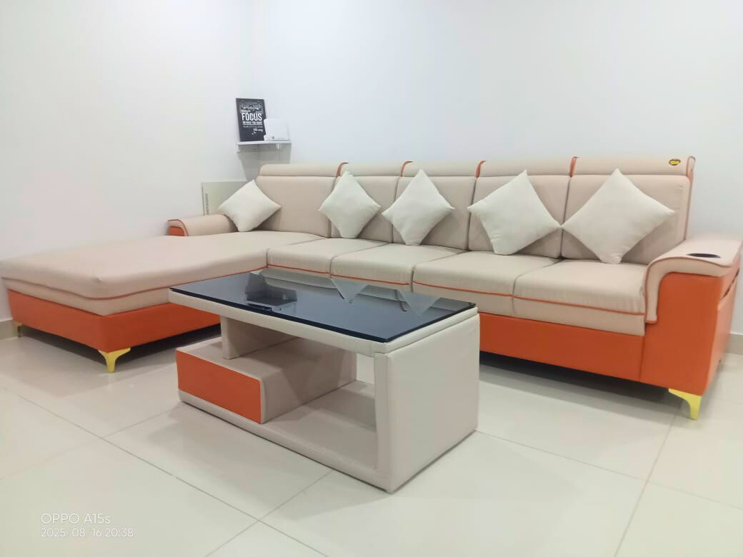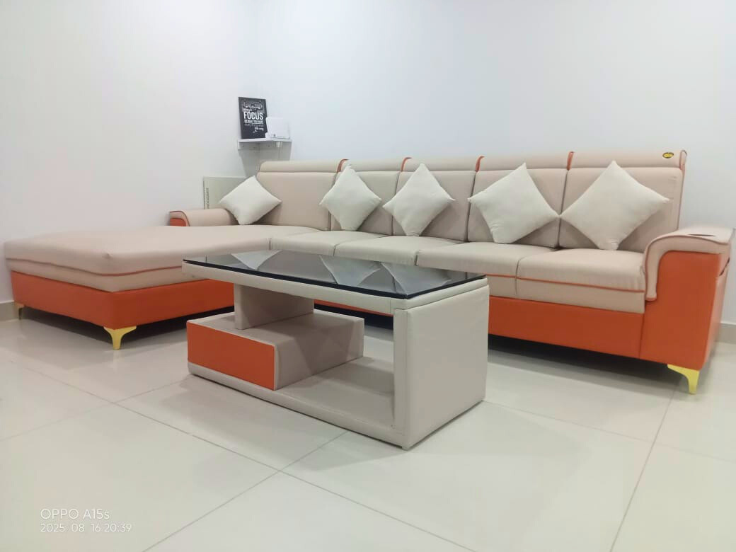 TAXZEK Modern L-Shaped Sectional Sofa Set with Glass Centre Table| 4-Seater| with Chaise Lounger| Cream and Orange| SS Golden legs