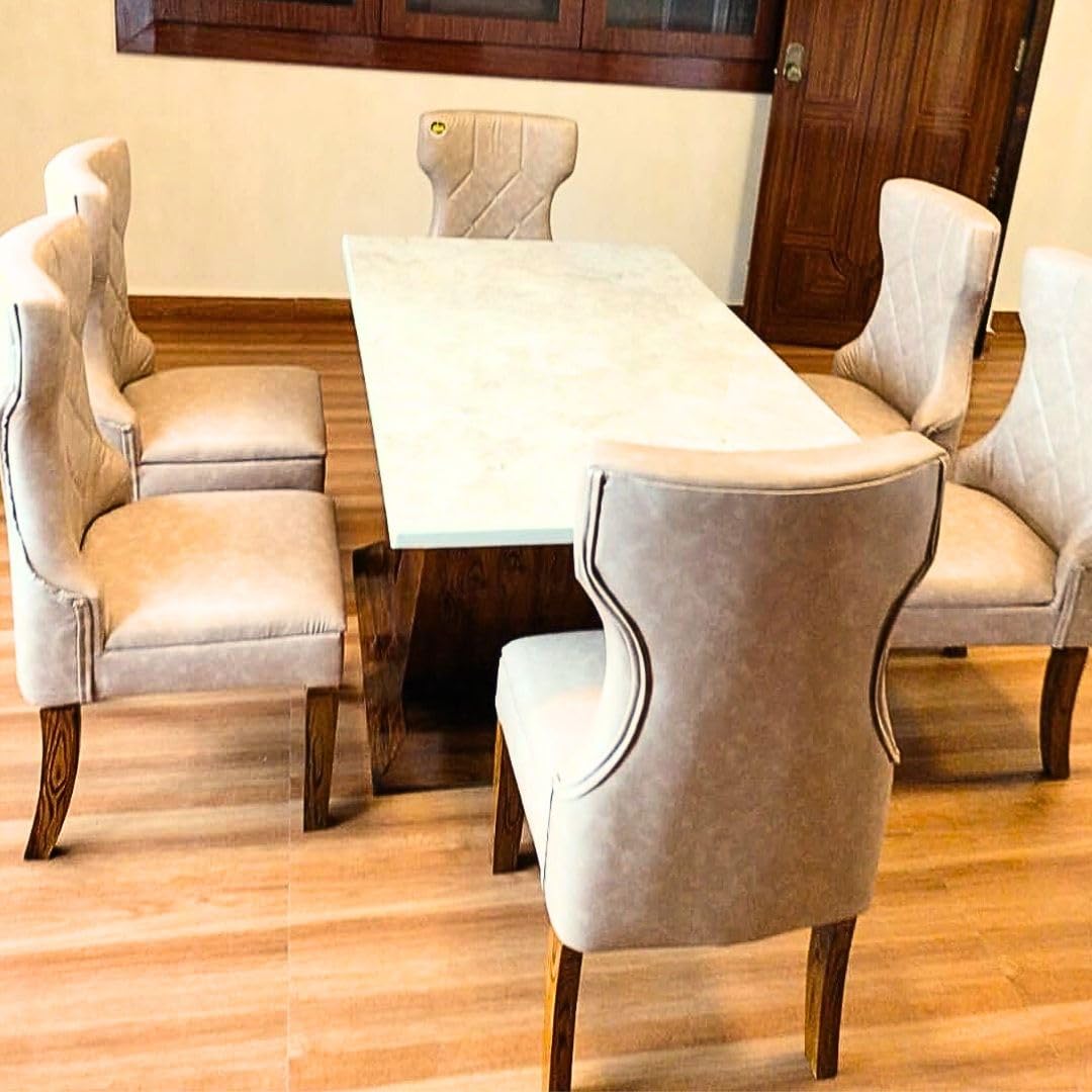 - FEATURES:- Marbel Size: 3/5 feet quates , Curved Design Chairs, V-Shaped wooden base with Polished .Chair Legs