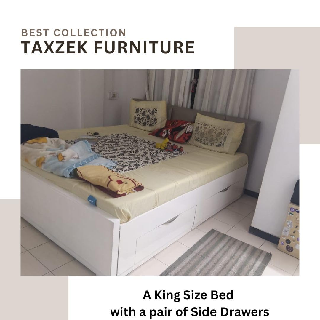 Taxzek White + Grey King Size Bed with 2 Rectangular Storage Drawers and Grey Soft Upholstered Headboard